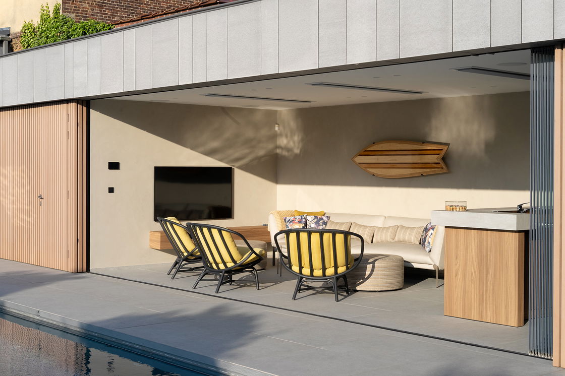 Pool and pool house with bar, landscaped gardens and terraces, versatile indoor/outdoor event areas with modern tech and AV for meetings and workshops, and secure gated parking for up to 3 cars.